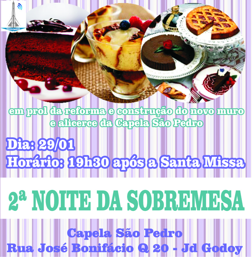2ª Noite da Sobremesa – São Pedro Home > Destaque > 2ª Noite da Sobremesa – São Pedro Imprimir página Publicado em 14/01/2017 Tweet 0 Capela São Pedro, convite especial! Informações 3239-2599 Voltar