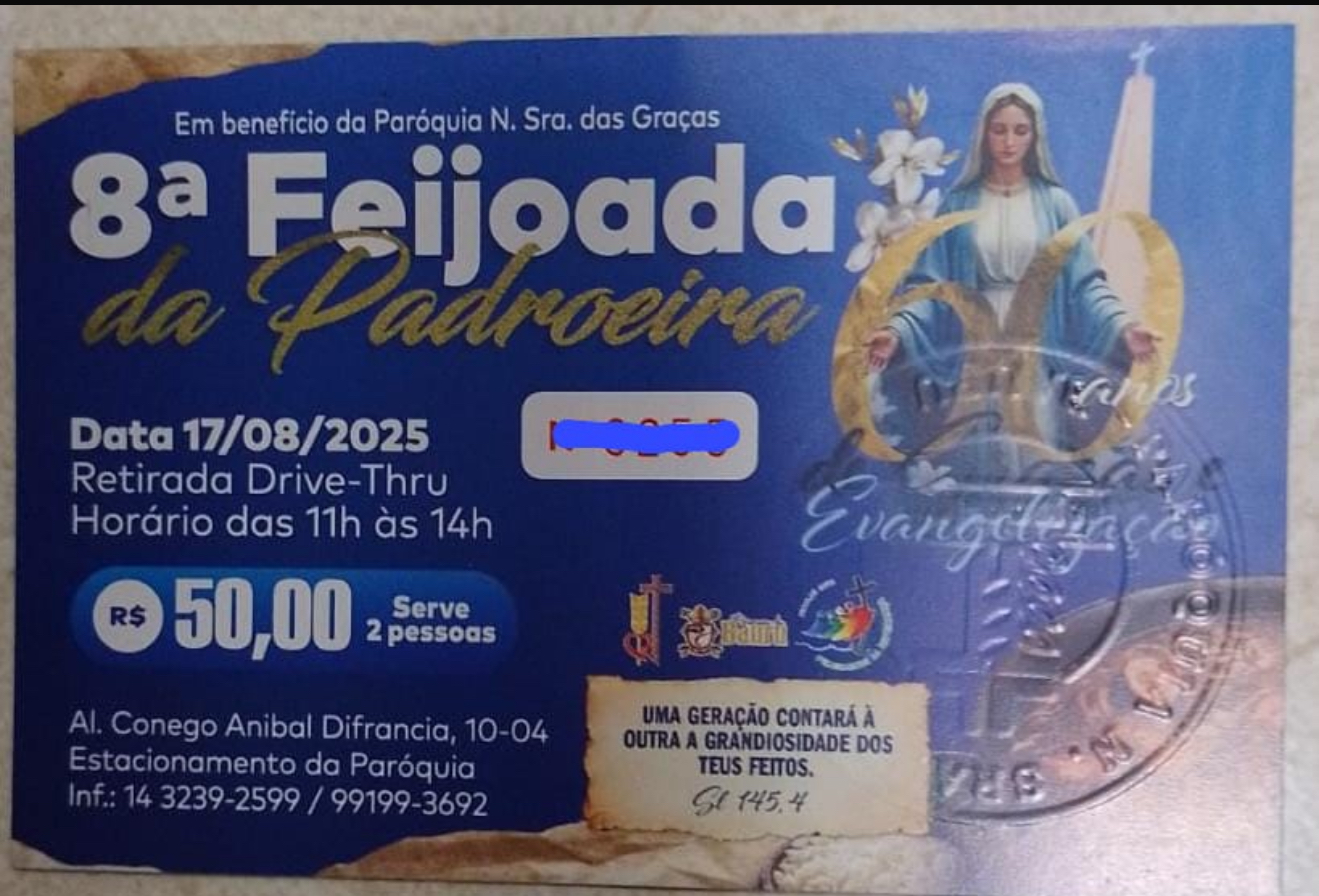 8ª Feijoada da Padroeira Home > Festas > 8ª Feijoada da Padroeira Imprimir página Publicado em 04/08/2025 Tweet 0 Data 17/08/2015 Retirada Drive-Thru – das 11h às 14h