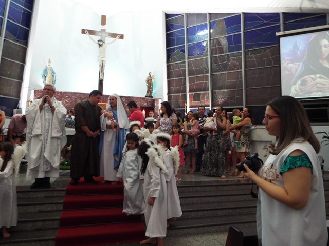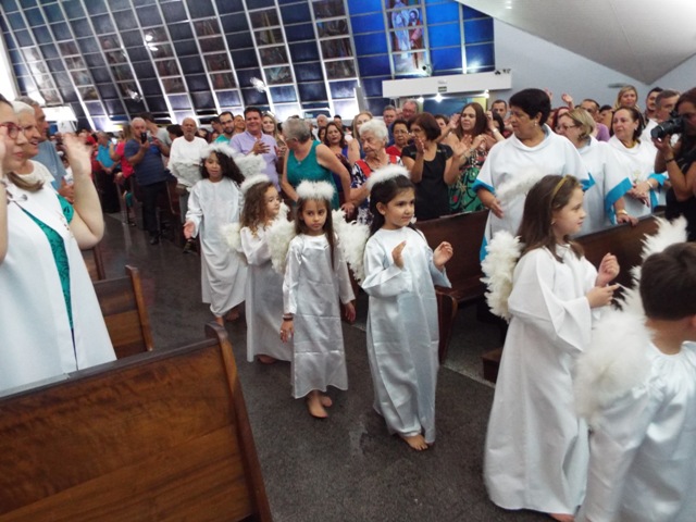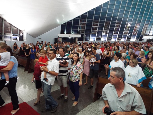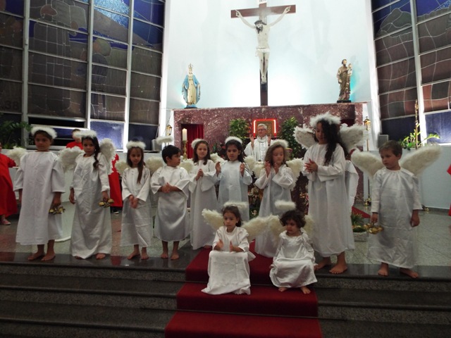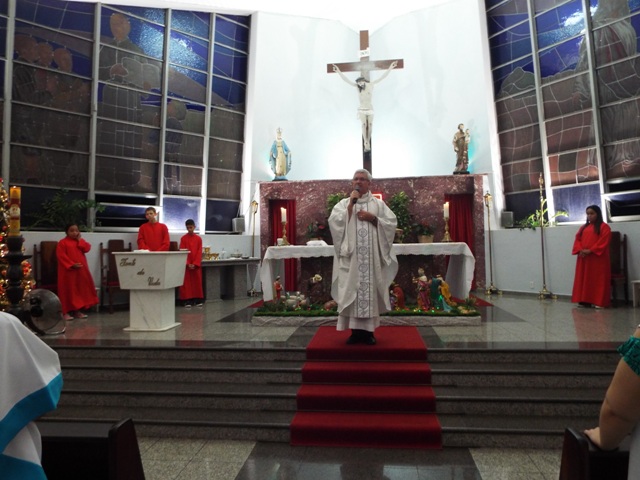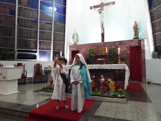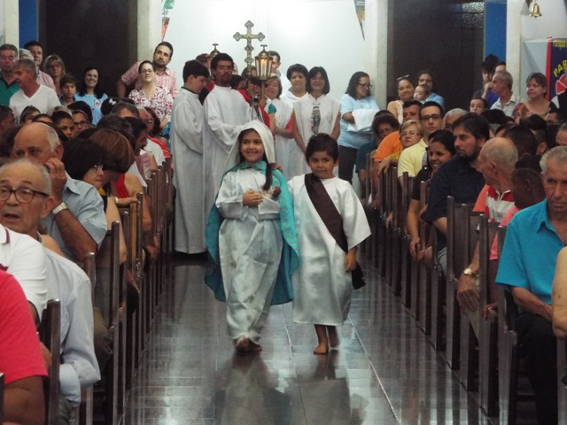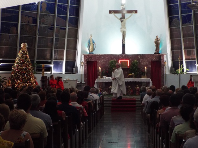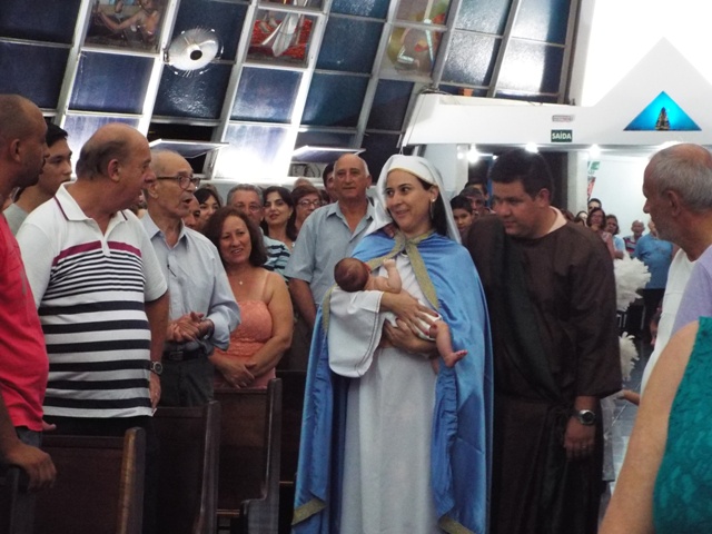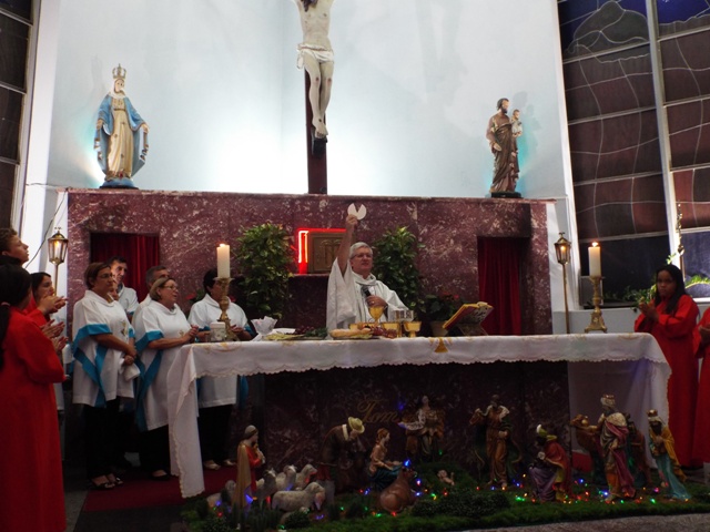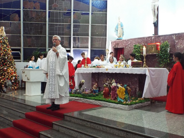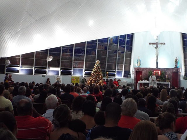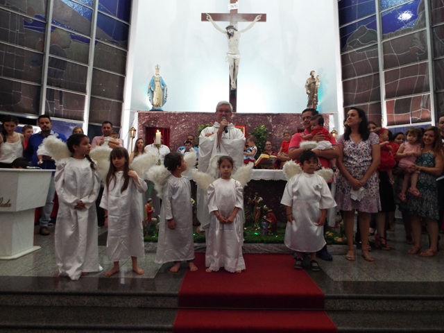 Nossa comunidade lotou a igreja matriz para celebrar com solenidade a missa do Natal do Senhor. A celebração foi presidida pelo Pároco e iniciou às 20 horas. Durante a missa foram batizadas duas crianças (Arthur e Lara) e uma jovem convertida ao catolicismo recebeu a primeira Eucaristia (Larissa). Na homilia o Pe. Gilson meditou o mistério do natal desde a perspectiva da temática do Ano da Misericórdia. “A Noite é feliz porque Deus recordou de sua misericórdia de geração em geração,” disse o Padre. No final da celebração foram apresentadas dezenas de mães com suas respectivas crianças e tantas outras vestidas de anjos.