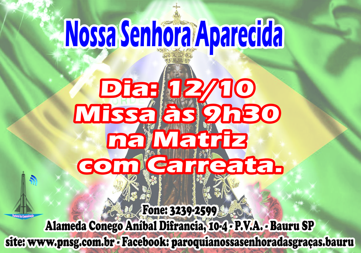 No dia 12 de outubro vamos participar da Santa Missa em nossa comunidade e vamos em seguida com a carreata até o Santuário Aparecida.