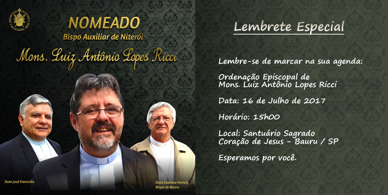 Neste domingo 16, será realizada a Ordenação Episcopal de Mons. Ricci, as 15h no Santuário do Sagrado Coração. Rezemos.