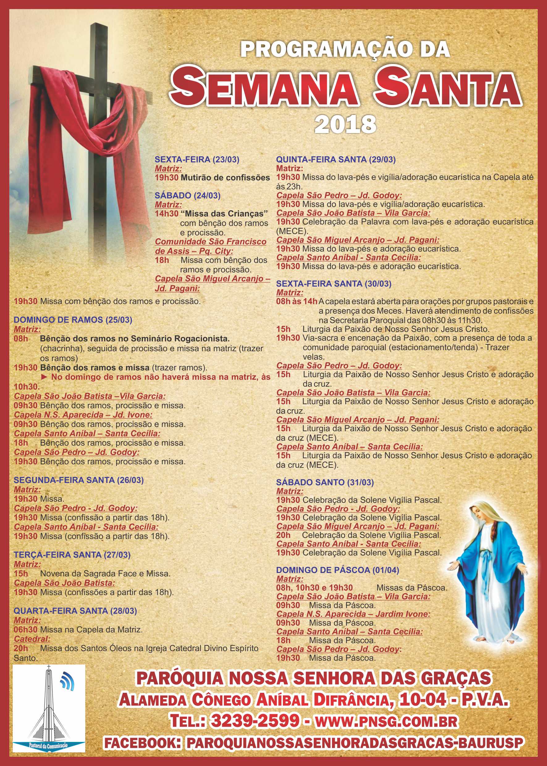 Programação da Semana Santa Home > Reflexões > Programação da Semana Santa Imprimir página Publicado em 09/02/2018 Tweet 0 Confira a Programação da Semana Santa 2018: https://www.pnsg.com.br/programacao-da-semana-santa/