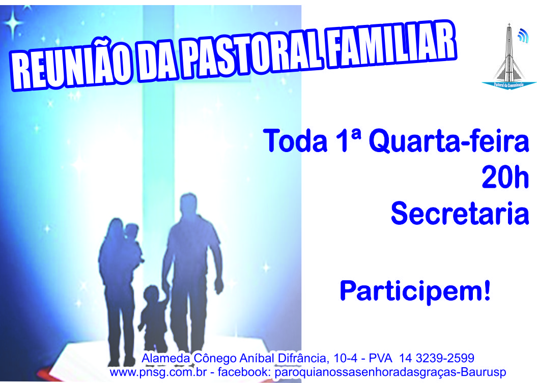 No próximo dia 5 de abril, será realizada a reunião mensal da Pastoral Familiar na secretaria da paróquia. Participe e seja um agente desta linda família que trabalha em prol de todas as famílias. Informações 3239-2599