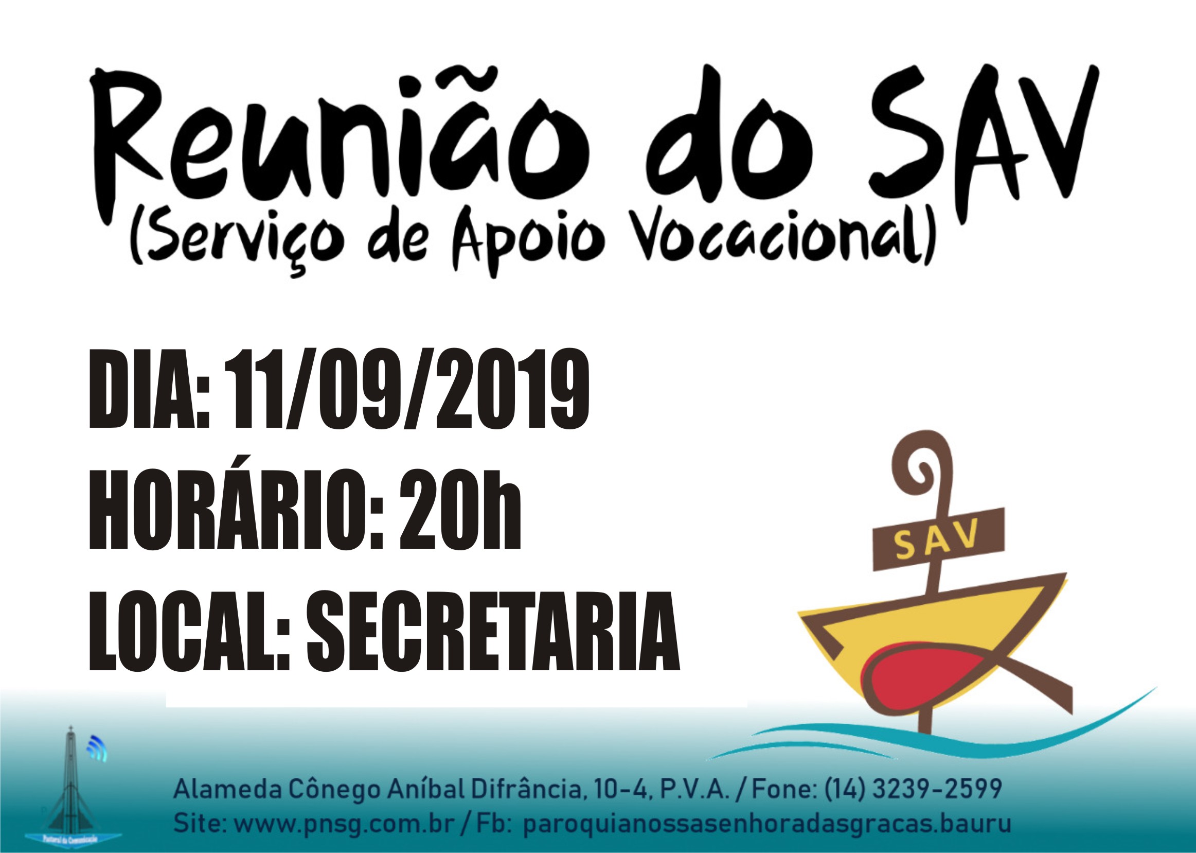 Reunião do SAV Home > Destaque > Reunião do SAV Imprimir página Publicado em 10/09/2019 Tweet 0 O Serviço de Apoio Vocacional se reunirá na próxima quarta, às 20h, na secretaria. Voltar