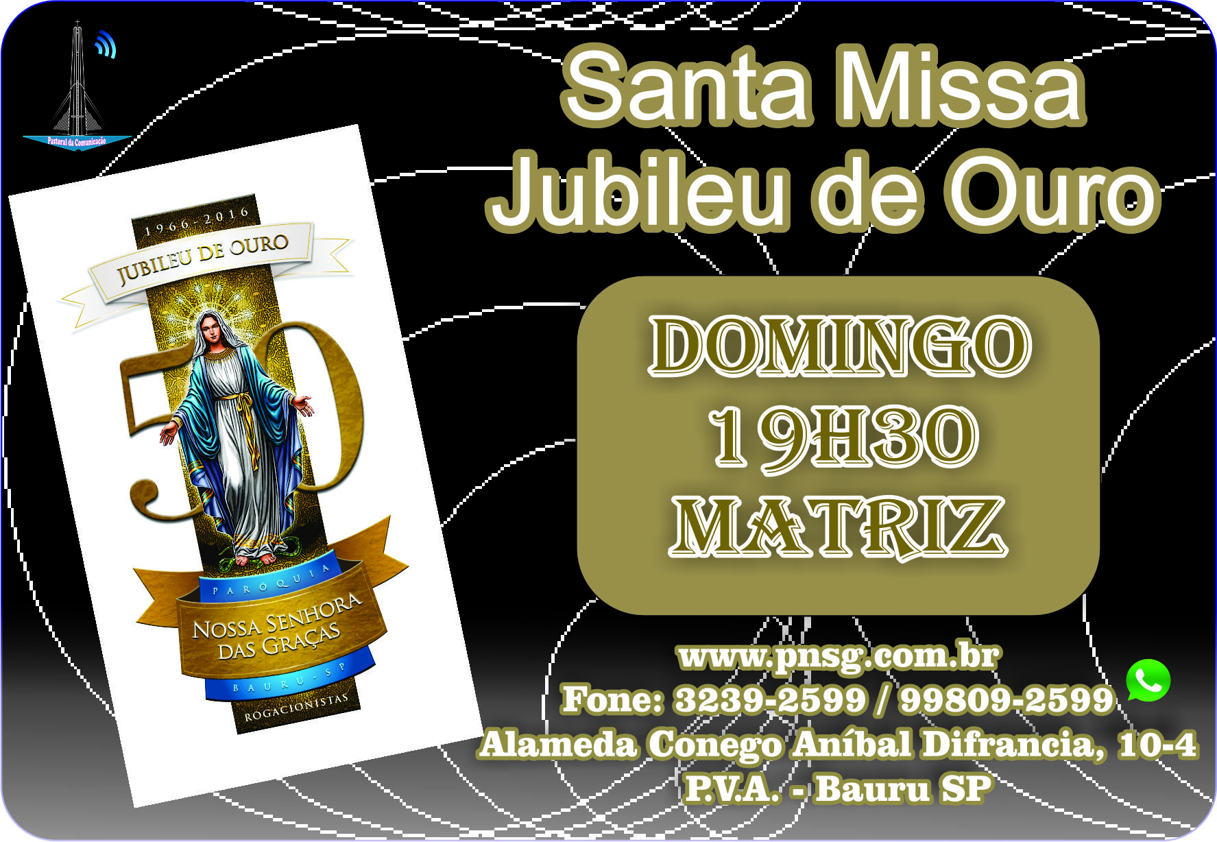 Neste domingo 14, nossa paróquia está em festa! A Santa Missa das 19h30 na matriz será especial, com a presença do nosso Bispo, Provincial e autoridades. Vamos juntos celebrar os 50 anos de graça de nossa paróquia. Após a missa coquetel a toda comunidade.