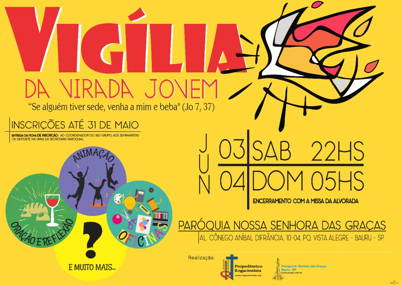 Os Jovens convidam a todos para participar da Vigília da Virada! Será uma noite especial, com muita oração, animação e oficinas. Faça sua inscrição e não fique de fora…. Informações na Secretaria 3239-2599.